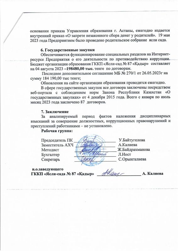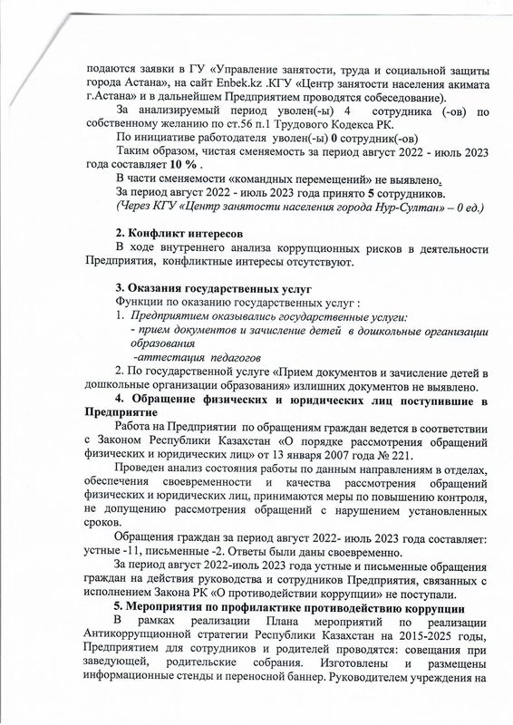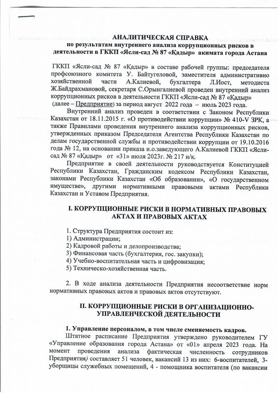 Аналитическая справка по результатам внутреннего анализа коррупционных рисков в деятельности в ГККП «Ясли-сад № 87 «Қадыр» акимата города АстанаСоздано: 10.08.2023, 20:31 | Просмотров: 70 > >