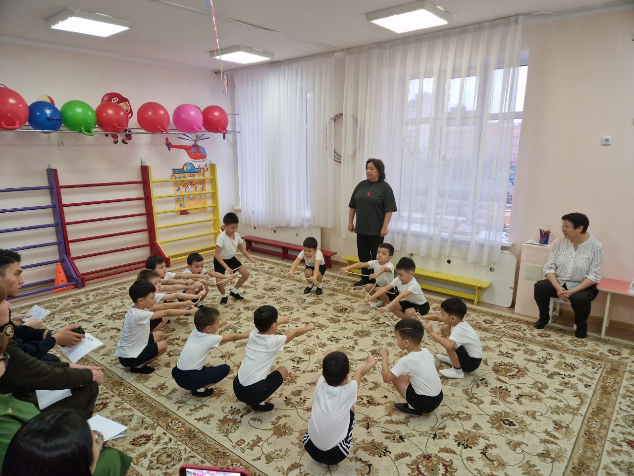 Инструктором по спорту К.Мухановой, воспитателем А.Ахметовой, муз.рукововдителем Г.Мурашбековой, с целью формирования представления о пожарной безопасности у дошкольников с детьми был организован физкультурный досуг «Пожарные на учении».
